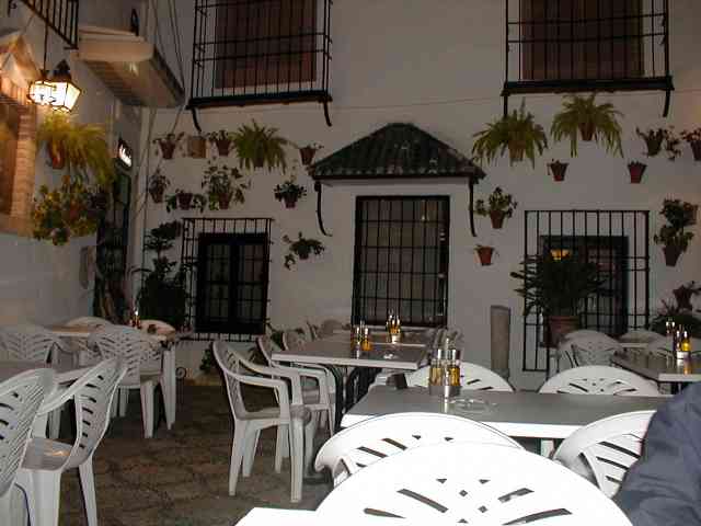 Alla sera a cena abbiamo mangiato al ristorante "Los Patios" (cioe' "I cortili"). Infatti il ristorante e' in un cortile interno ad una casa, e' molto carino ed e' arredato con vasi e con una piccola fontana. La nostra cena e' stata a base di spaghetti alla "bolognesa" e di tortilla espanola (frittata con patate molto buona). Finita la cena torniamo nella nostra stanza d'albergo, molto piccola, buia e, al confronto con quella che avevamo a Madrid, e' alquanto squallida. Comunque per una sola notte e' tutto sommato confortevole.